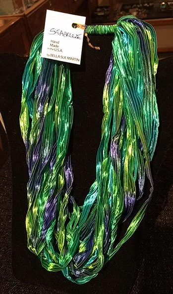 Bella’s woven garments and dichroic glass jewelry are distinctive due to their bold shimmery colors and eye catching designs. When she isn’t busy creating, Bella enjoys gardening and spending time with her goldendoodle Cody. When Bella and Cody go on road trips together, Bella loves stopping at new places and searching for unusual yarns to use in her latest textile creations.